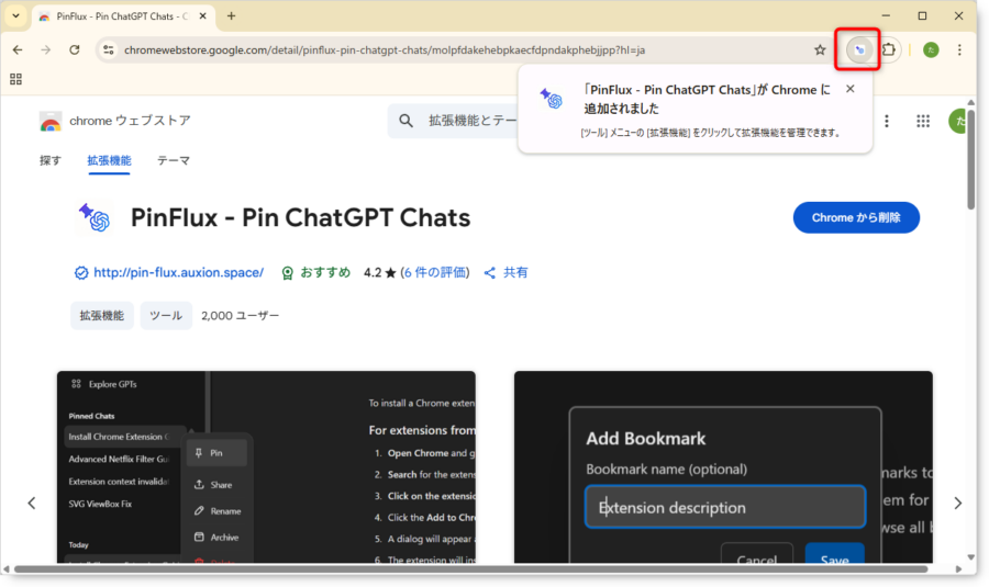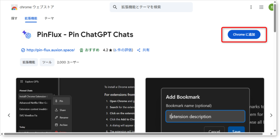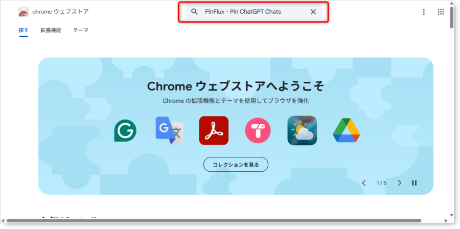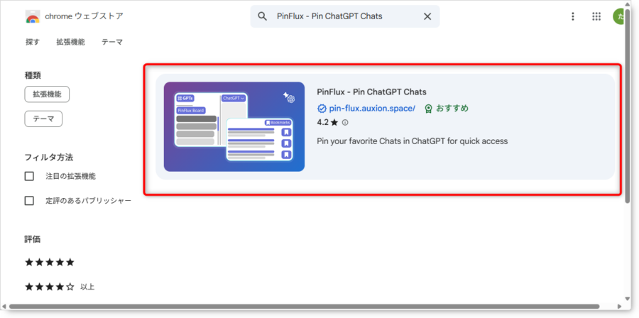 拡張機能を検索する: ウェブストアの検索バーに、導入したい拡張機能の名前(例: 「PinFlux – Pin ChatGPT Chats」)を入力して検索します。