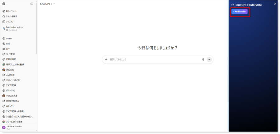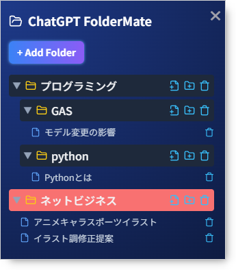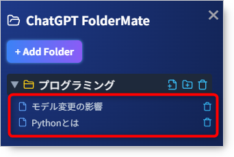 FolderMateを使えば、会話をテーマ別や用途別にフォルダへ分類できるため、学習メモ、リサーチ、業務プロジェクトなどを効率的に管理可能です。