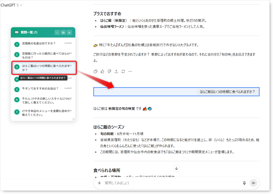 つまり「AI質問ナビゲーター」は、会話を時系列で追うしかなかった従来の使い方を一歩進め、質問中心に整理された“見やすいナビゲーション”を実現する拡張機能といえるでしょう。