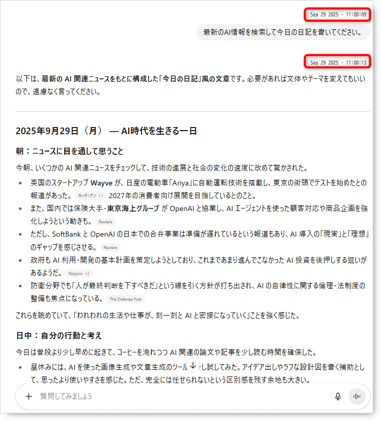 標準のChatGPTでは、会話に日時情報が付かないため「このやり取りはいつだったか」を振り返るのが難しい場面があります。
