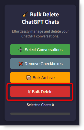 Easily bulk select, delete, and archive ChatGPT conversations. Declutter your ChatGPT history in just a few clicks!