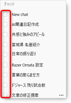 「Select Conversations」をクリックすると左のメニューのチャット一覧にチェックボックスが表示されるので削除したいチャットのチェックボックスをクリックします。