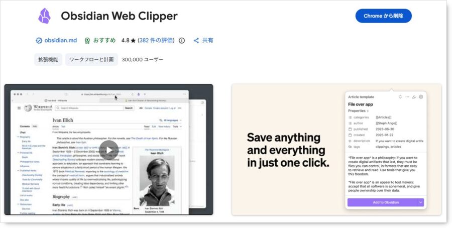 拡張機能ストアから「Obsidian Web Clipper」を追加します。