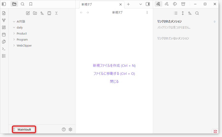 2.Vault名を確認: Obsidianアプリ側を開き、現在使っている「保管庫(Vault)名」を確認します。