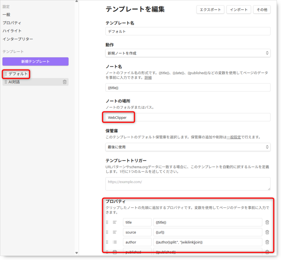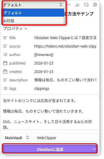 僕はObsidian Web Clipperの中に「AI対話」という専用テンプレートを組み込んでいます。