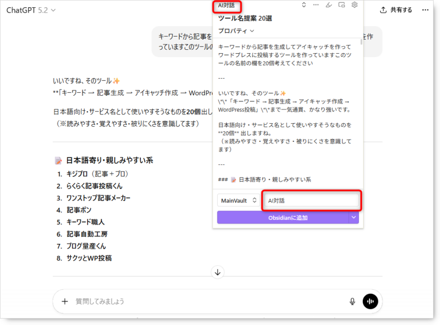 これまでは「全選択してコピペして、Obsidainを起動して、フォルダを選んで保存」という面倒な作業が壁になり記録を諦めていました。