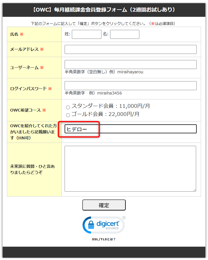 僕の特典を受け取るには、OWCに申し込む際の紹介者のところに「ヒデロー」と入力して申し込んでください。