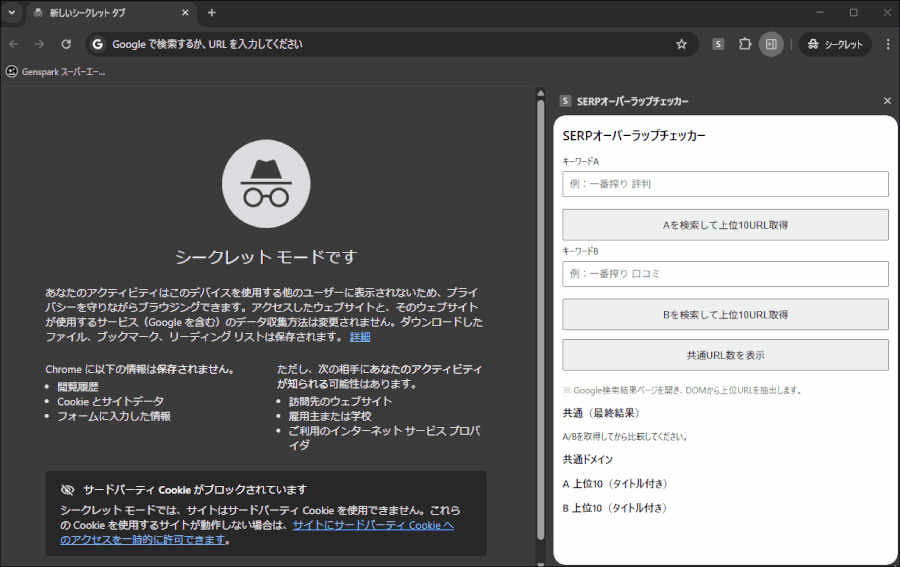ノイズを排除する「シークレットモード対応」: 自分の検索履歴に左右されない、まっさらなSEOデータを取得できます。